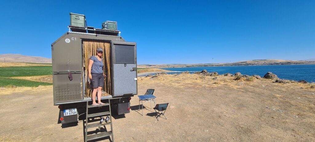 Am Tümpel angekommen, war die Größe des Sees schon beachtlich, erinnerte eher an ein Meer. Die Stellplatzsuche, schnell erledigt mit Maps. Der erste Stellplatz war von der Lage ein Traum, hatte aber den Scharm einer Müllhalde. Vor allem taten einem die Tiere leid, viele Landschildkröten zwischen Plastikflaschen, Tüten, Folie und Schaumstoffschalen… 😢.