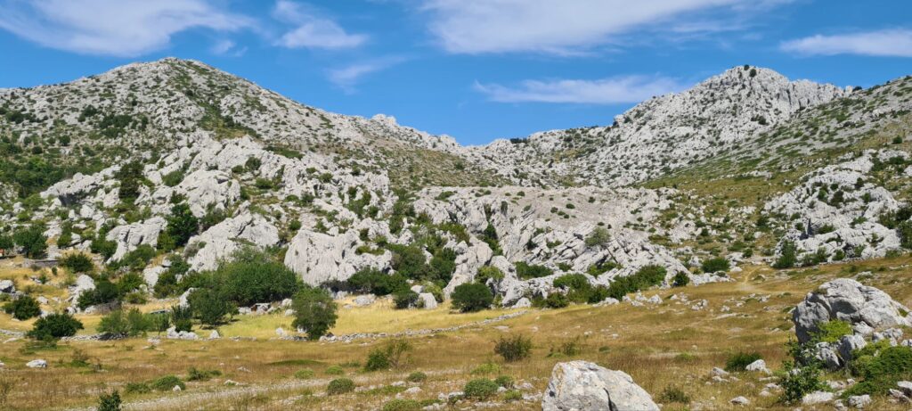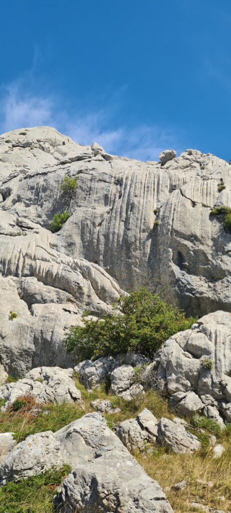 Am Tulove Grede angekommen hat man eine atemberaubende Aussicht bis fast nach Zadar an der Küste. Die unwirklich wirkenden Felsformationen lassen einen in Kindheitserinnerungen schwelgen, man erwartet fast das Pierre Brice und Lex Barker um die Ecke geritten kommen. Cowboy und Indianer – wird das heute überhaupt noch gespielt (zwinker) ?