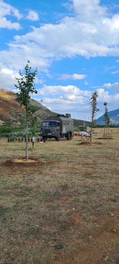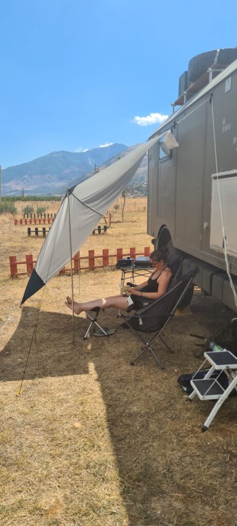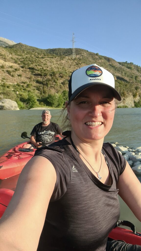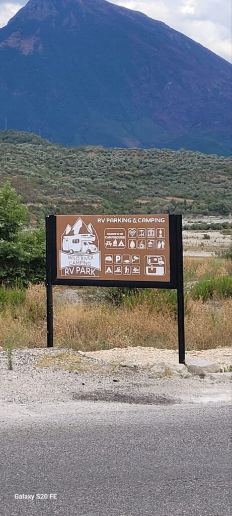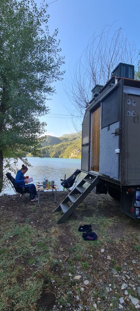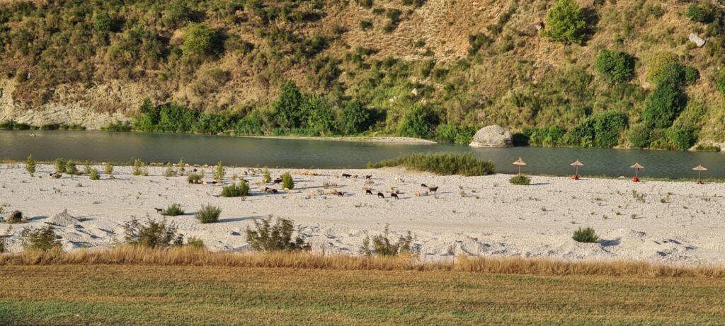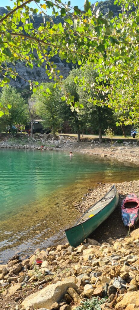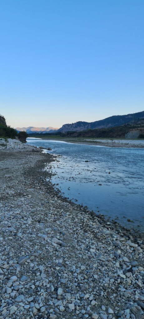 Der erste Stop war ein See am Rande der Berge mit einer Wassertemperatur fast wie in der Badewanne. Sehr zu empfehlen. Danach ging es zum Fluss Vjosa. Auch hier gibt es am Stellplatz wenig zu meckern, da er noch ziemlich neu erscheint. Bei sehr warmen Wetter ist der Weg zu den Stellplatzliegen und Kajaks jedoch etwas weit… am Abend geht es dann doch für ein paar Stündchen.