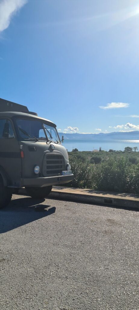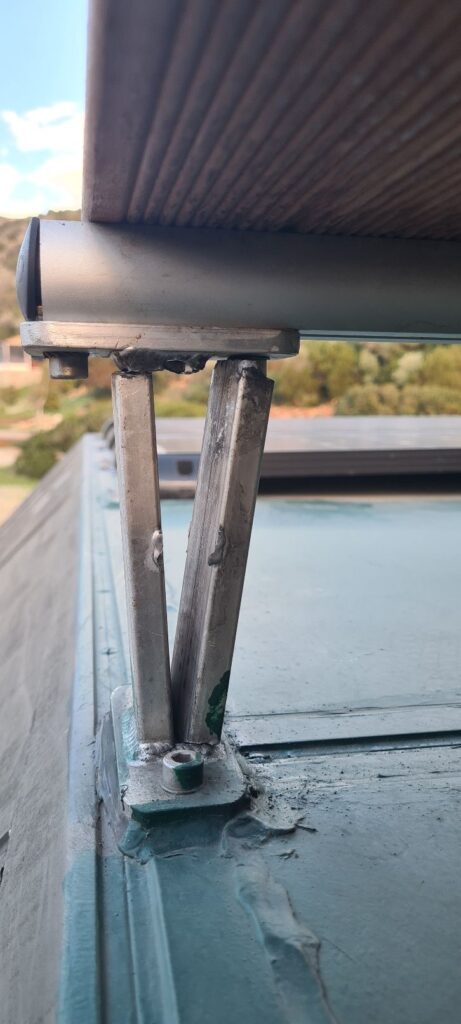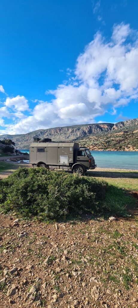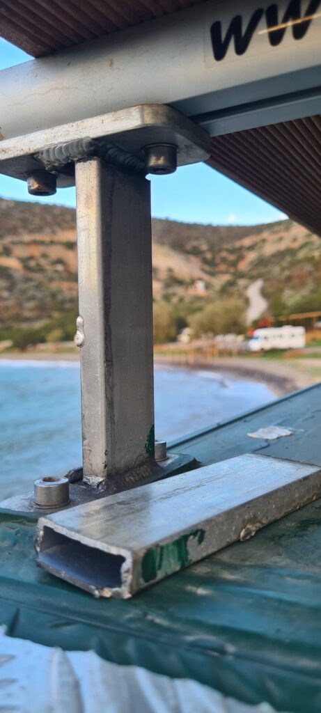 Das angekündigte Wetterchaos blieb aus und wir sind weiter zum Golf von Korinth. Geparkt haben wir dann in einer Bucht. Nach dem ersten Advent wollten wir über Patras weiter in Richtung Süden. Durch einen Zufall entdeckte ich jedoch ein erhebliches Problem, das die Weiterreise erstmal unmöglich machte. Gebrochene Dachträgerstützen zwangen uns zu einem weiteren Tag Pause in der Bucht. Schnell einen Griechen kontaktiert, der eventuell einen Tipp hat… Die Trägerkonstruktion ist aus Alu und musste geschweißt werden. Wir sind dann auf Anraten in die nächsten Dörfer zurück, um eine passende Werkstatt zu finden. Zum Glück bot uns eine Werkstatt Hilfe an und wollte das Problem mit seinem Kumpel (Schweißer) am Abend mit uns besprechen… am Ende haben wir uns für Edelstahlstützen entschieden. Die Aluträger waren dann wohl mit dem bisschen Offroad überfordert. Alu fehlt halt etwas an Flexibilität im Gegensatz zu Stahl. Er hat uns noch am selben Abend neue Stützen geschweißt und wir konnten sie dann am nächsten Abend einbauen lassen. Wieder geht mein Dank an die Jungs von der Werkstatt, die etwas „Out of the Box“ denken können.