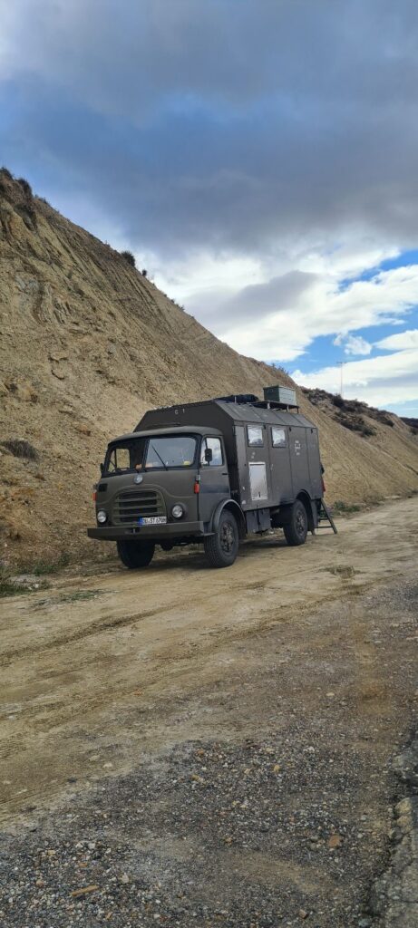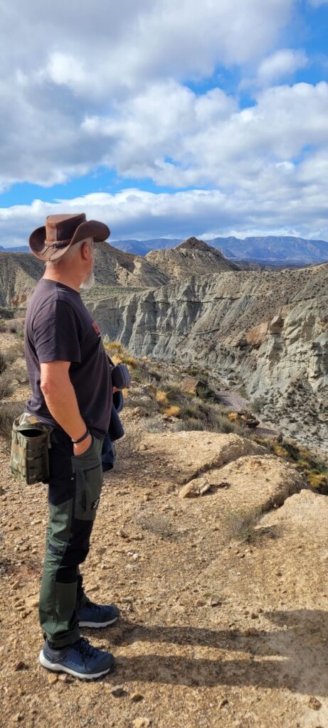 Die Regenfront Ă€nderte wohl ihre Meinung, zumindest war sie als wir am Dusty ankamen nicht mehr zu sehen. Wir fuhren wieder zurĂŒck in Richtung Western Leone. Denn kurz davor konnte man mit dem Camper auf einem Hochplateau ĂŒbernachten und weit in die TĂ€ler der Tabernas schauen. Mir viel auf, dass wir direkt auf einen weiteren Drehort von Indiana Jones blickten, der leider auf privatem WĂŒstengelĂ€nde lag. Was den Ausblick vom Dusty aus noch beeindruckender machte. Am Abend war Filmgucken angesagt, ratet mal welchen đđ.